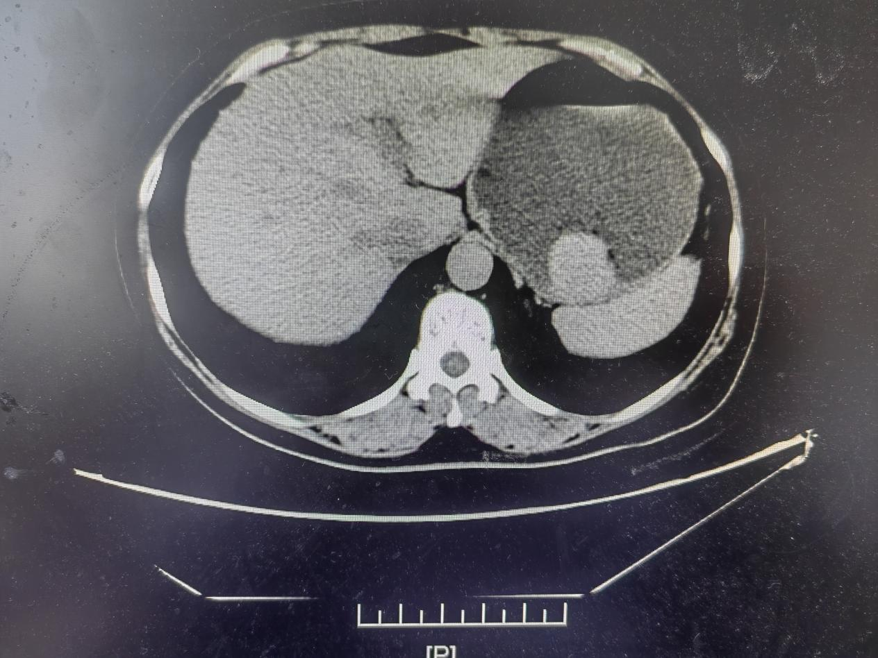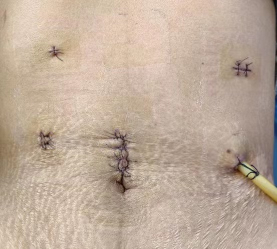 患者,女性,45岁,系因反复上腹部不适10月,我院胃镜检查提示胃底隆起性病灶入住普通外科,术前CT提示间质瘤。既往2月前因子宫肌瘤在外院开腹大切口行子宫切除。术后患者疼痛感明显,故患者要求微创治疗。经科室讨论后为患者行全腔镜下胃间质瘤切除术。手术顺利,术后恢复良好。