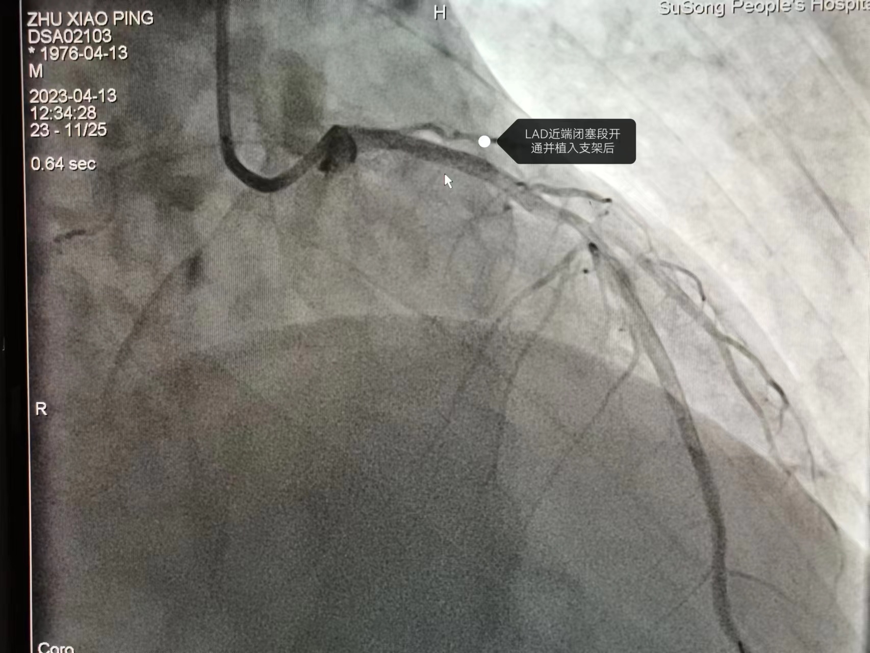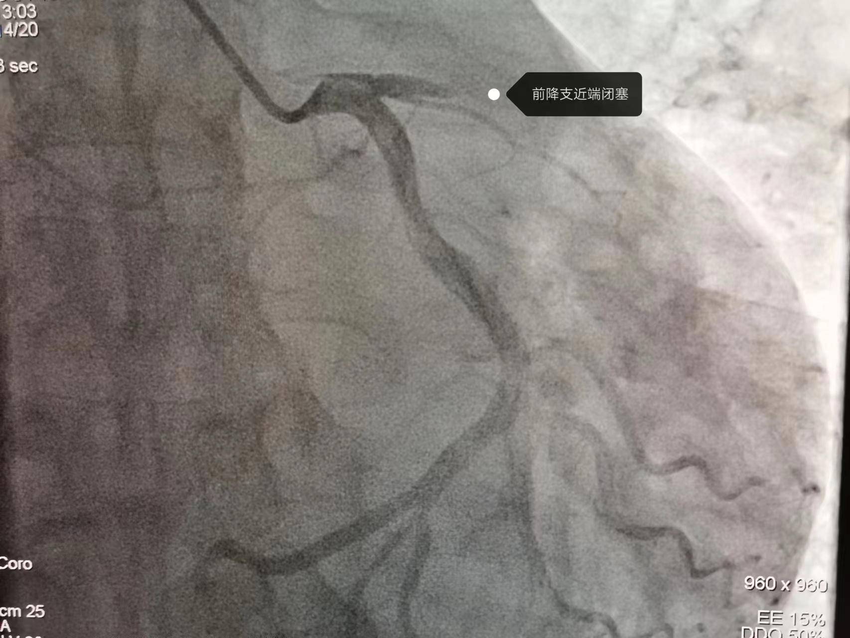 今年46岁、家住隘口乡的祝某,上午9:42在我院做心电图后没及时离开,随后说还有些不舒服,在心电图室再次做心电图提示急性广泛前壁心梗。然而,患者病情变化始料未及,10 时02分,患者突发意识不清,四肢抽搐,触摸大动脉搏动消失,患者呼吸心跳骤停。至此,一场与死神的赛跑拉开帷幕。临床电生理学中心主任李江琴和徐秀春、张敏医生轮流心肺复苏并立即启动院内发生ACS救治流程联系胸痛中心团队。在医务科主任贺叔书统一调度下,急诊科、ICU、麻醉科、导管室、心内科主任马成亮等胸痛中心专家团队十几名医护人员迅速展开救治,通力合作,上演了一场与死神赛跑的生死时速。大家紧张地忙碌着,给予电除颤7次、静脉推注抢救药、气管插管、呼吸机辅助呼吸等......经过一个多小时的抢救,患者自主心跳终于恢复、但仍然无自主呼吸。考虑随时有恶性心律失常及心跳骤停风险,在ICU行呼吸支持下转运至导管室。在导管室团队密切配合、麻醉科全麻呼吸支持下,马成亮主任带领张守刚、杨凯等医生行急诊PCI治疗。开通闭塞的前降支血管,植入一枚支架,术后患者心电图ST段下降>50%,TIMI血流恢复3级,患者心肌得到有效再灌注。