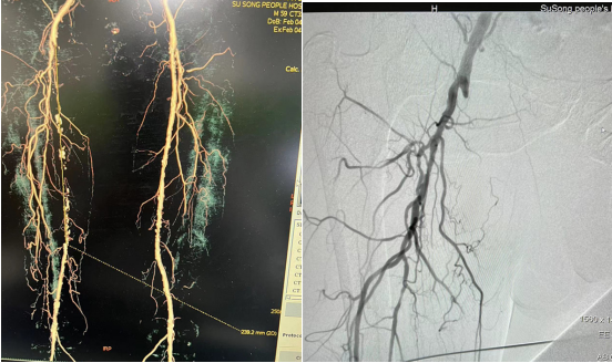 经康复医学科、医学影像中心等多科室讨论,并与患者及家属充分沟通征得同意,2月7 日下午14:00在上级专家指导下行右下肢动脉造影加血管成形术的介入治疗。术中开通闭塞段血管逐段行球囊扩张,并置入两枚动脉血管支架。术后造影右下肢血流畅通,患者症状亦明显改善。
